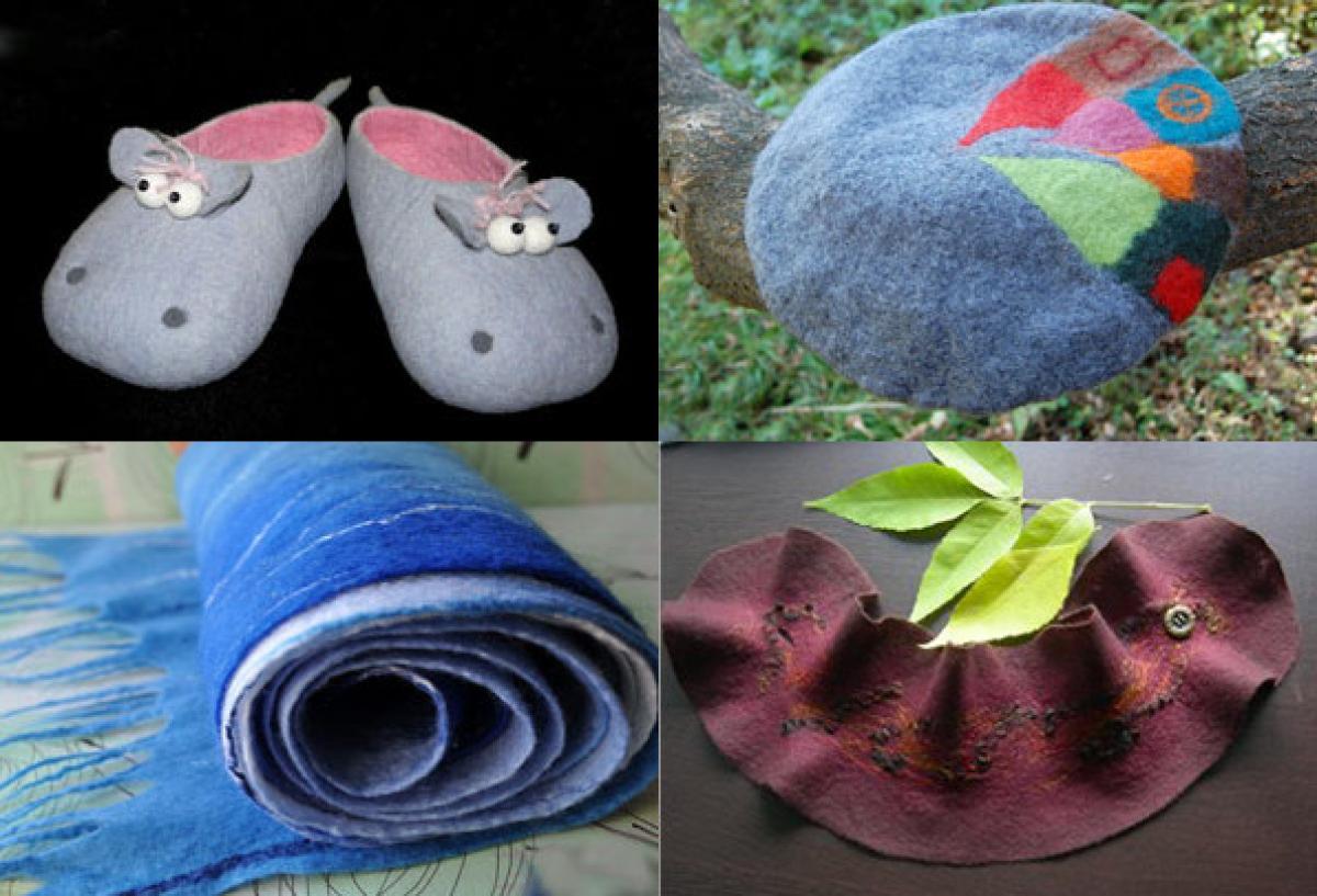 Finally felt is used in creating clothes. Felt is a natural product and retain heat, which makes it the perfect material for hats, scarves, slippers, and so on. There is also a designer felt, a real work of art! Felt can be stacked layers, glued, embroidered and combined with other materials, which kames you a proud owner of quite extraordinary and unique thing!